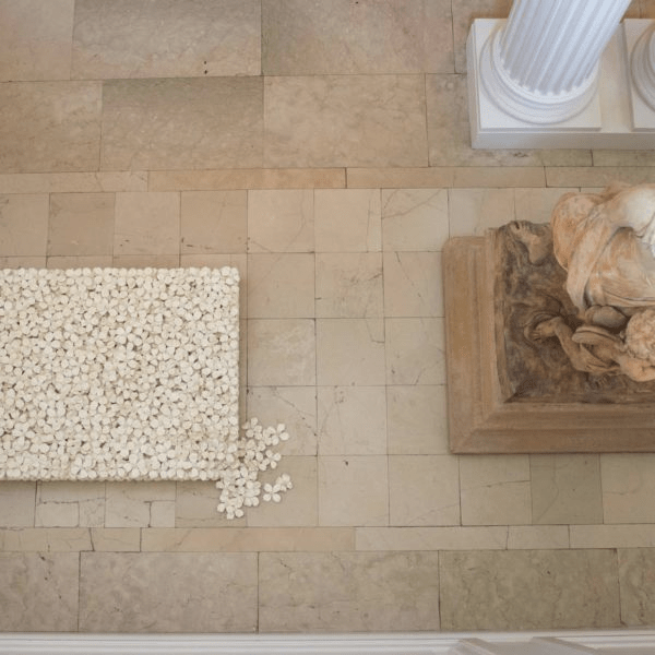 Minako says, “We call this Komorebi, which is the Japanese word for filtered light, sunbeams seen through leaves in the forest. They’re individual ceramic pieces arranged like they fell from the tree and were scattered by the wind. The ceramic blossoms are kept in place on the floor with silicone.”