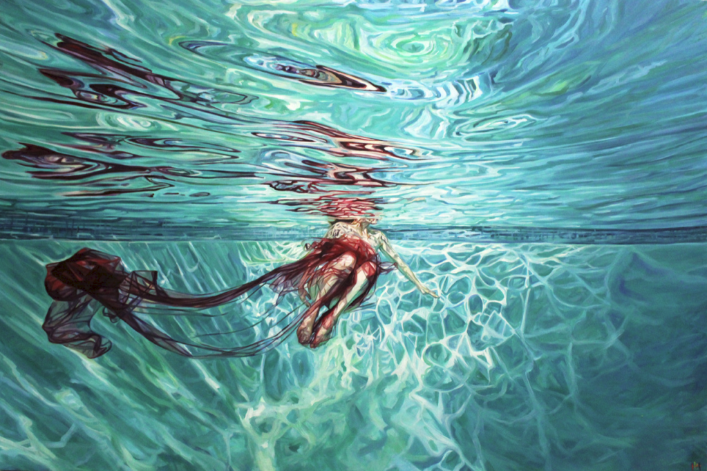 And it’s here that Horton continues to practice her craft – taking photos of friends underwater in their pool and using the pictures as the basis for the oil paintings in this exhibition. Her 16th solo show “Immersion,” will be on display at Whimsy Pasadena in Old Town through Sunday, October 22. She will be painting live onsite at the gallery on Thursday, Friday and Saturday (October 19, 20, and 21) from 11am to 5pm to let the public in on her creative process and talk to visitors about her journey.