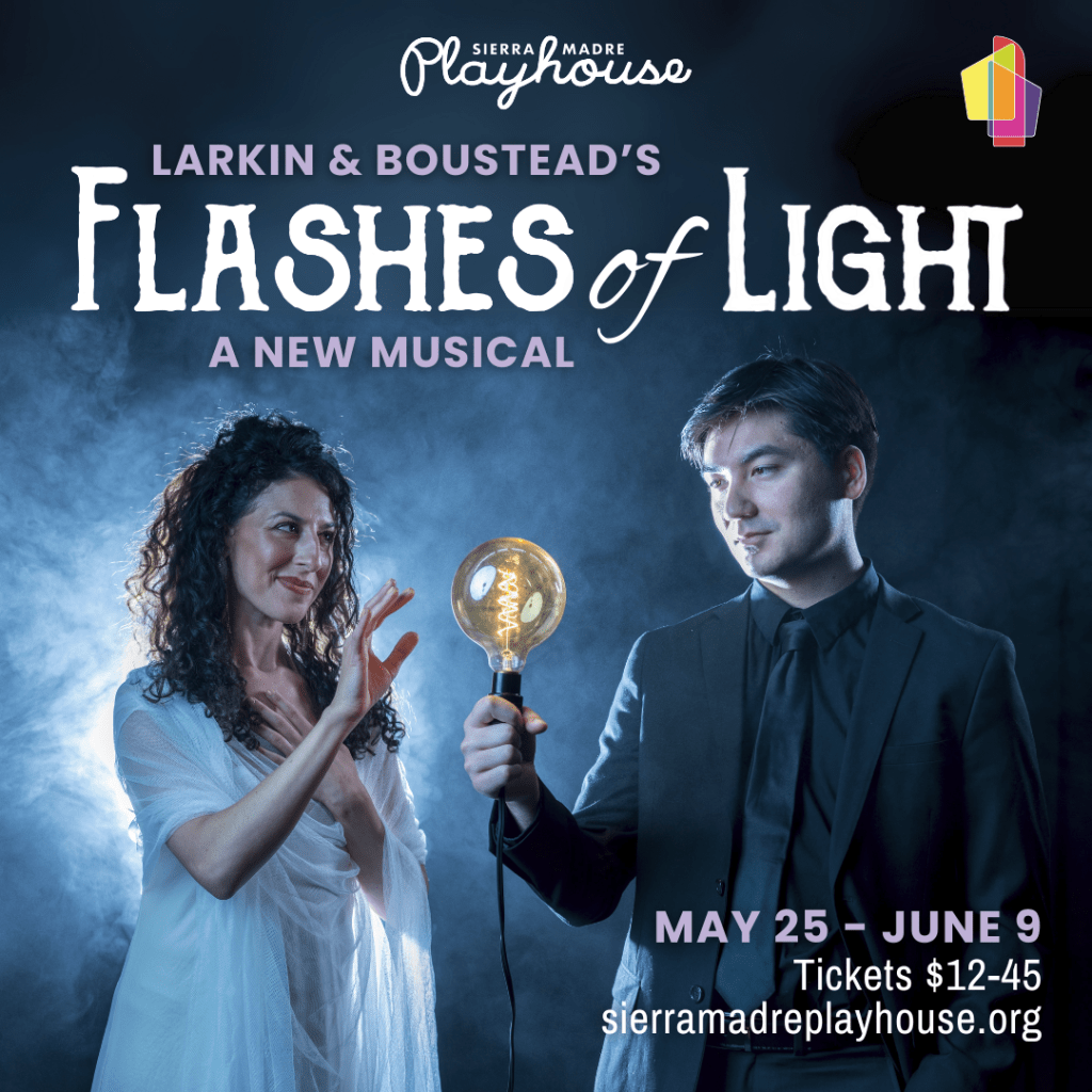 Asked why they chose to debut their production in an intimate setting, Larkin and Boustead reply, “In April of 2024, we performed a concert of songs from our show at the El Portal Theatre in Noho, which we filmed. A friend of mine, who attended the concert, happens to be on the board of Sierra Madre Playhouse, and brought our project to the attention of Matt Cook, the artistic director. Matt thought ‘Flashes of Light’ would be an exciting addition to their 2025 calendar and approached us about staging our first run in their 99 seat theater setting. We love the historic and intimate vibe of SMP, and find it a welcoming atmosphere to get our production on its feet.”