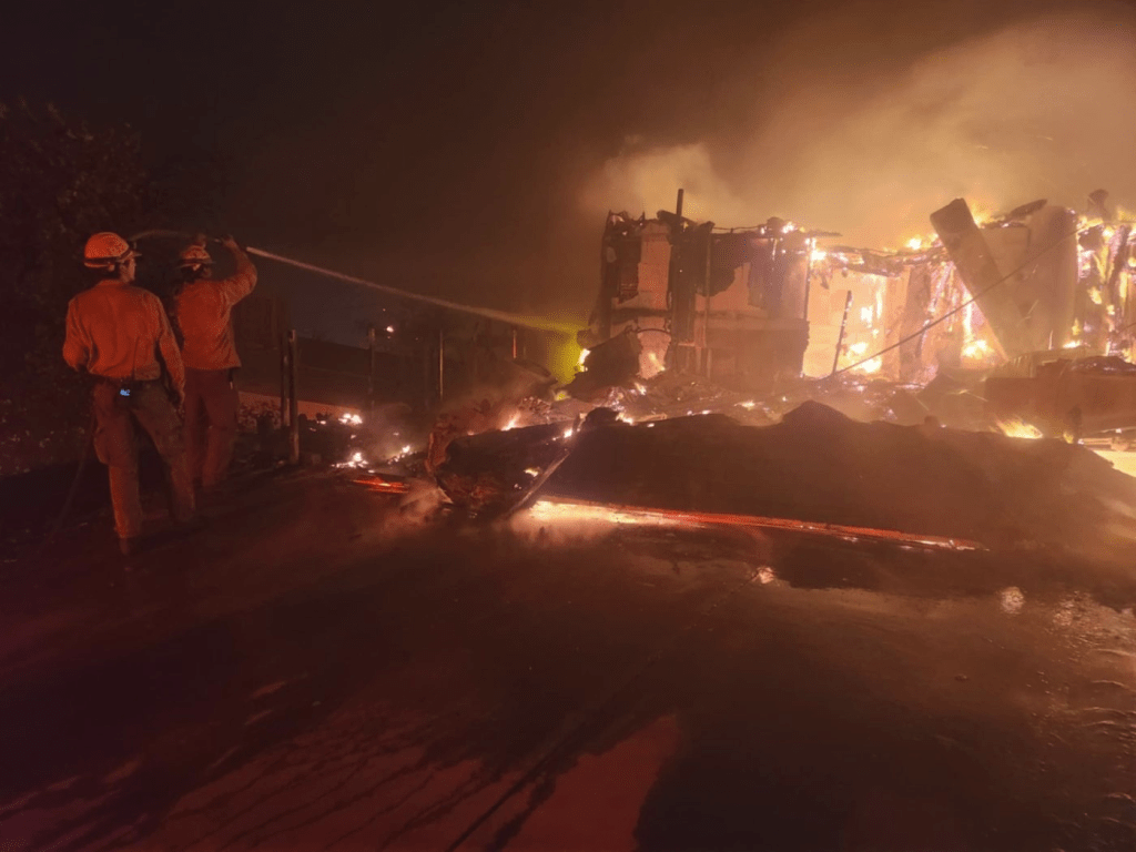 Firefighters spray water from a hose during the Eaton Fire. | U.S. Forest Service photo taken by Capt. Jason Benton / Courtesy of Wikimedia Commons